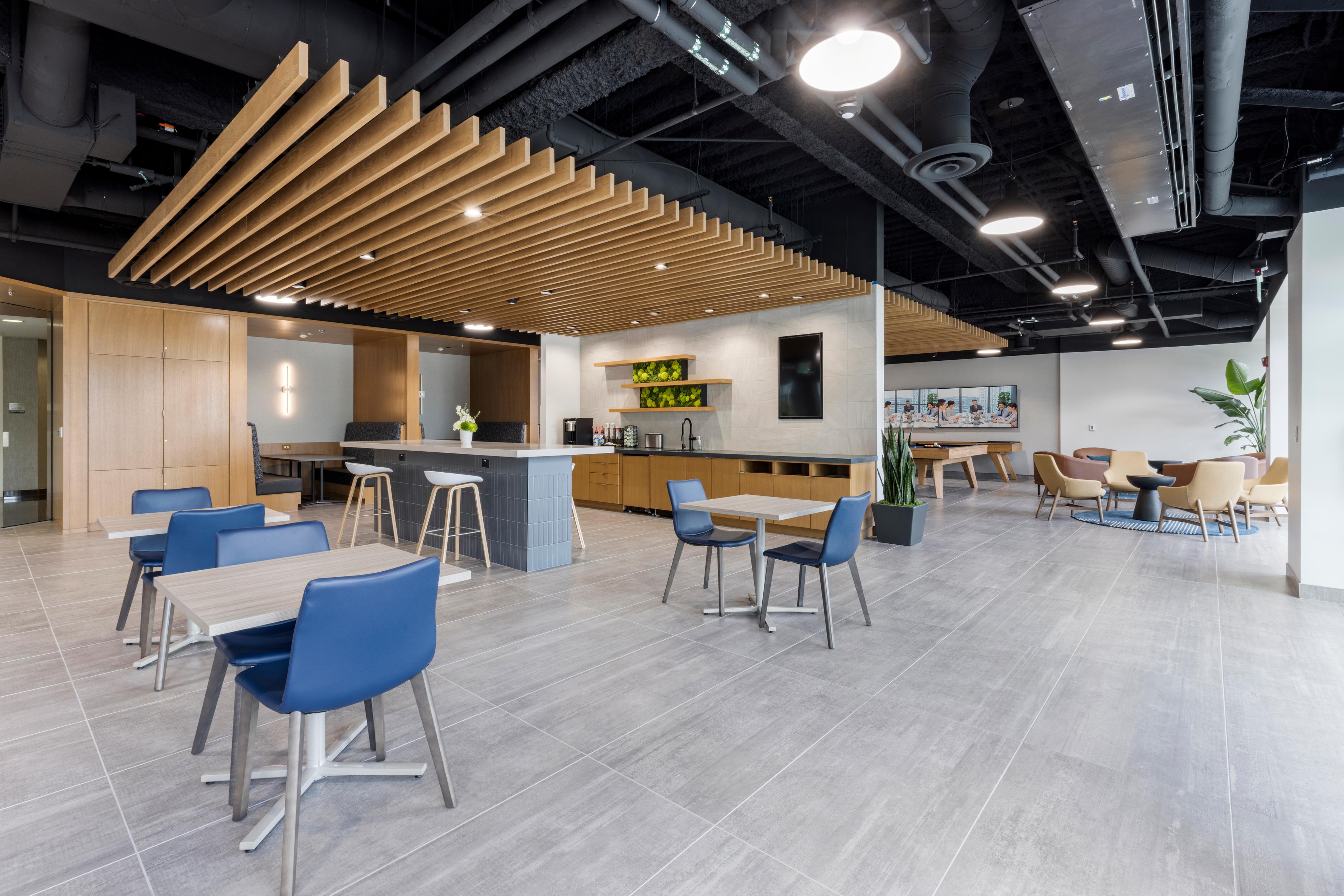 This project was for the construction of multiple tenant amenities at the Cottonwood Corporate Center office complex. The work took place in buildings 9 and 10 of the Center and included interior and exterior improvements. In Building 9, interior renovations were completed to create a new coffee bar and lounge area and a game lounge. A new dedicated Conference Center was built in Building 10 that features a folding door that enables the room to be subdivided into two varying size smaller conference rooms, improving functionality for tenant companies. The exterior scope of work was for the addition of a sizeable outdoor recreation space that features seating areas with firepits, additional outdoor tables and seating, ping pong tables, and the first pickleball court built at an office complex in the state of Utah.
