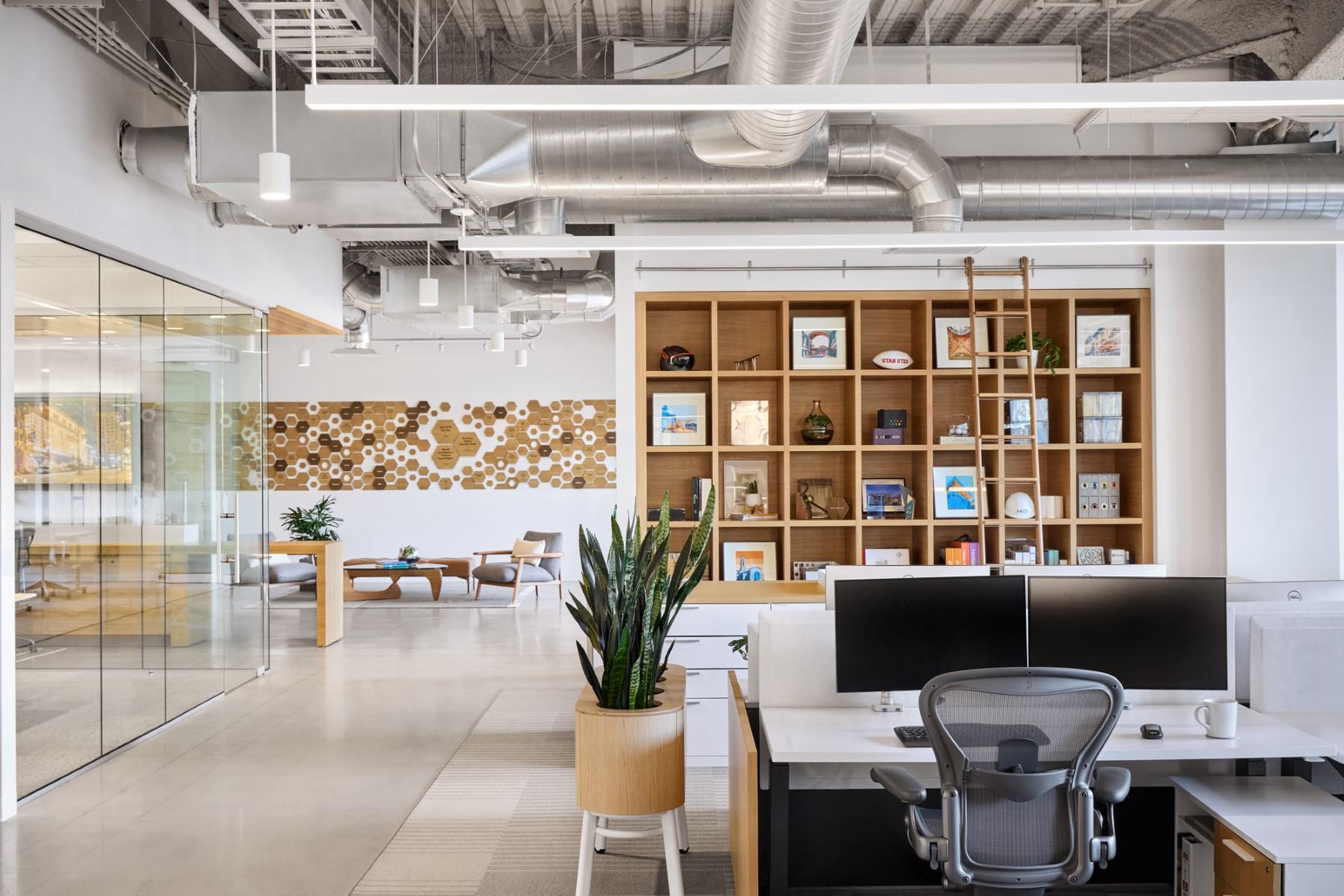 This tenant improvement buildout prepared a new home for HKS Architects in 222 Main, a premier downtown high-rise. The workspace features a welcoming reception area, versatile conference facilities, and an expansive open office layout with focus rooms and collaborative team spaces. A dedicated wellness center and modern breakroom support employee wellbeing. Working in an occupied multi-tenant high-rise required precision logistics and meticulous coordination to minimize disruption to neighboring tenants. Site constraints called for just-in-time deliveries throughout the project. The team also incorporated select doors and hardware salvaged from HKS’s previous office, balancing sustainability goals with design objectives.