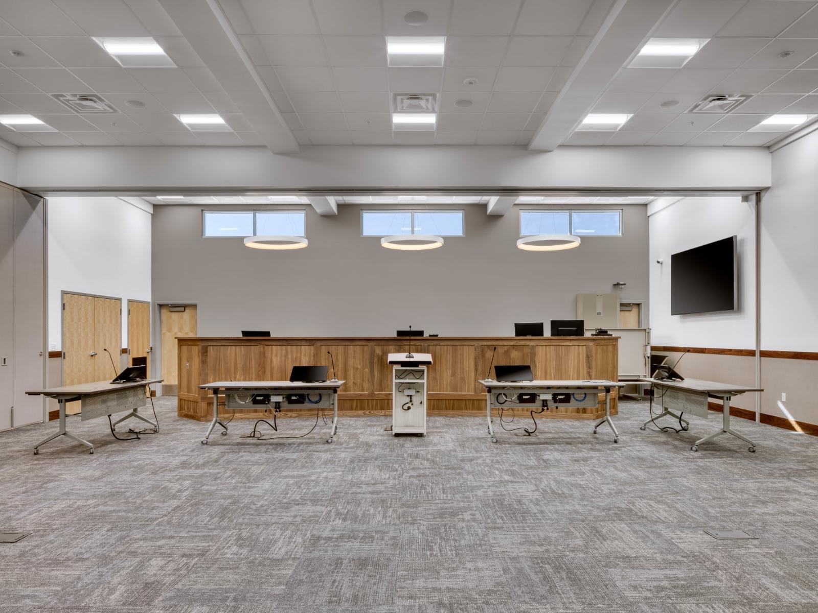 This design-build project delivered a new facility to house the city’s Police Department and Justice Court, replacing an outdated building that no longer met city needs. The single-story steel-framed structure features a CMU, brick veneer, and architectural concrete exterior. Interior spaces for both departments include a secure sallyport entrance, processing areas, patrol offices, armory, interview rooms, storage, courtroom, judge’s chambers, prosecutor office, and jury room. Support spaces include a fitness room, locker rooms, breakroom, and kitchenette. Site work included drought-resistant landscaping, retaining walls, perimeter fencing, utility coordination, and demolition of the previous police/court building.