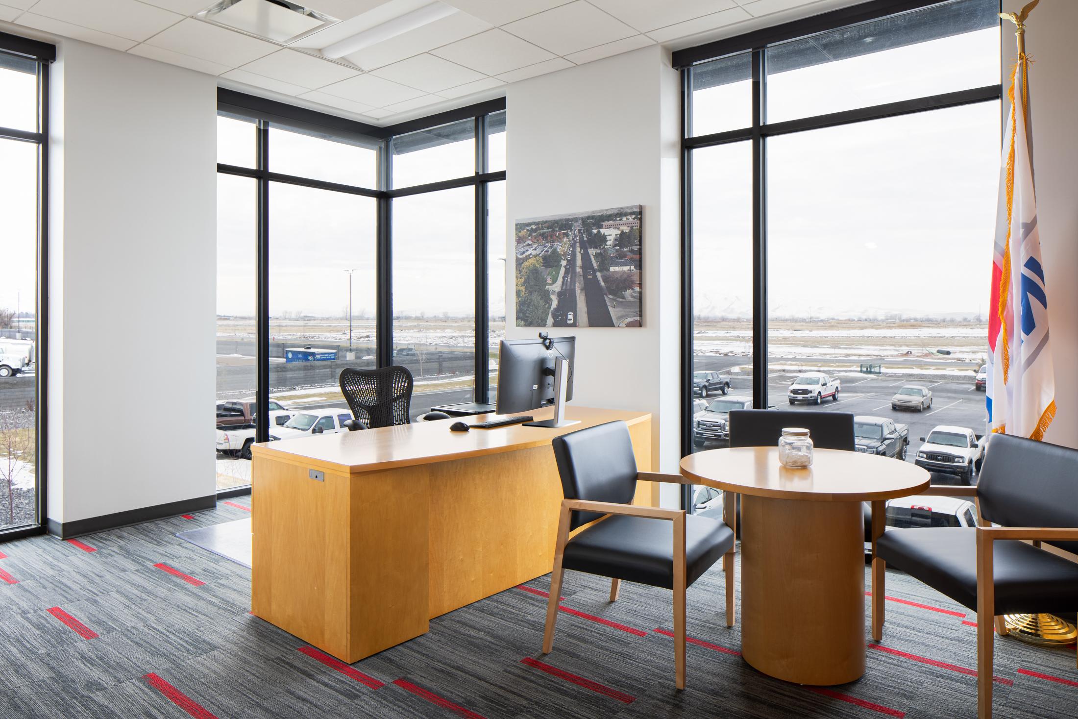 This multi-function facility houses offices for both Sunroc and Sunpro along with a large eight-bay shop. The two-story office building features a central lobby, private offices, open office space, large and small conference rooms, copy-work stations, a training room, employee break room, and support spaces. The transition area between offices and shop is also two-story, including a fitness center, extensive storage, a shop office, and dedicated shop employee break room. The approximately 23,000-square-foot shop area includes a welding shop, oil and lube bay, paint booth, and truck wash bay. Multiple pull-through bays are served by compressed air and oil and lube systems.